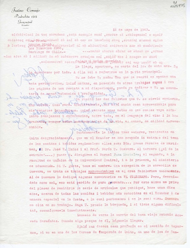 [Carta] 1963 mayo 12, Guayaquil, Ecuador [a] Oreste Plath, Santiago, Chile [manuscrito] Justino Cornejo.