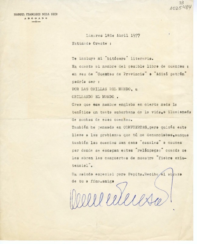 [Carta] 1977 abril 1, Linares, Chile [a] Oreste Plath [manuscrito] Manuel Francisco Mesa Seco.