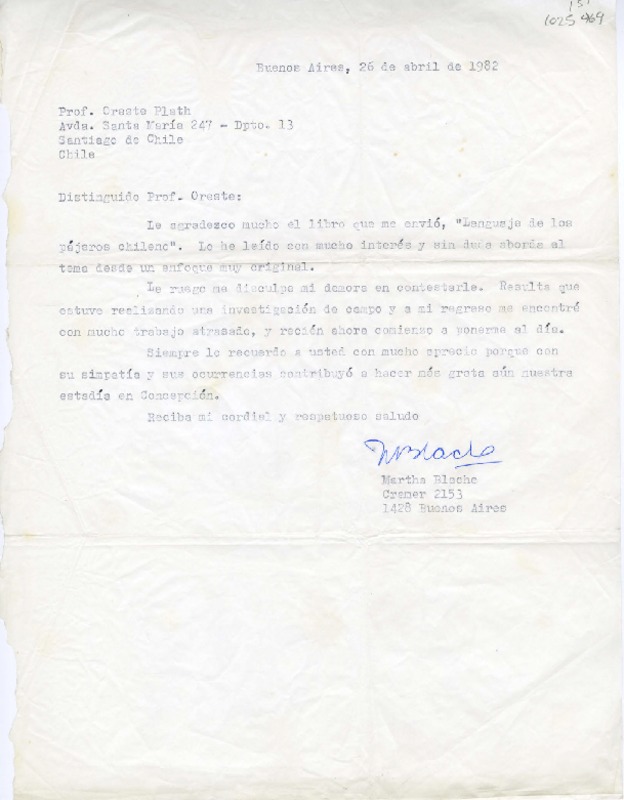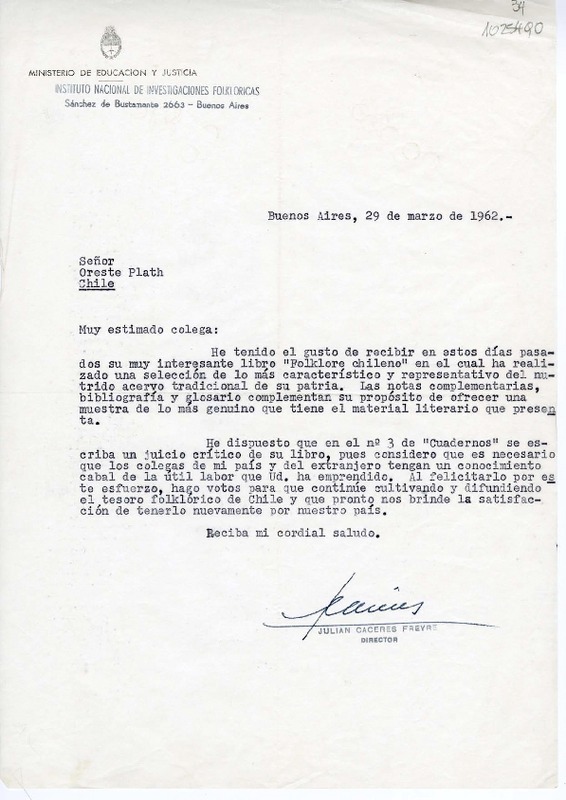 [Carta] 1962 marzo 29, Buenos Aires, Argentina [a] Oreste Plath [manuscrito] Julián Bernardo Cáceres Freyre.