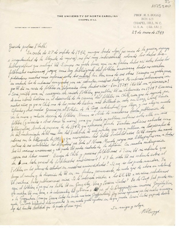 [Carta] 1943 enero 29, Chapel Hill, N.C. [E.E.U.U.] [a] Oreste Plath [manuscrito] Ralph Steele Boggs.