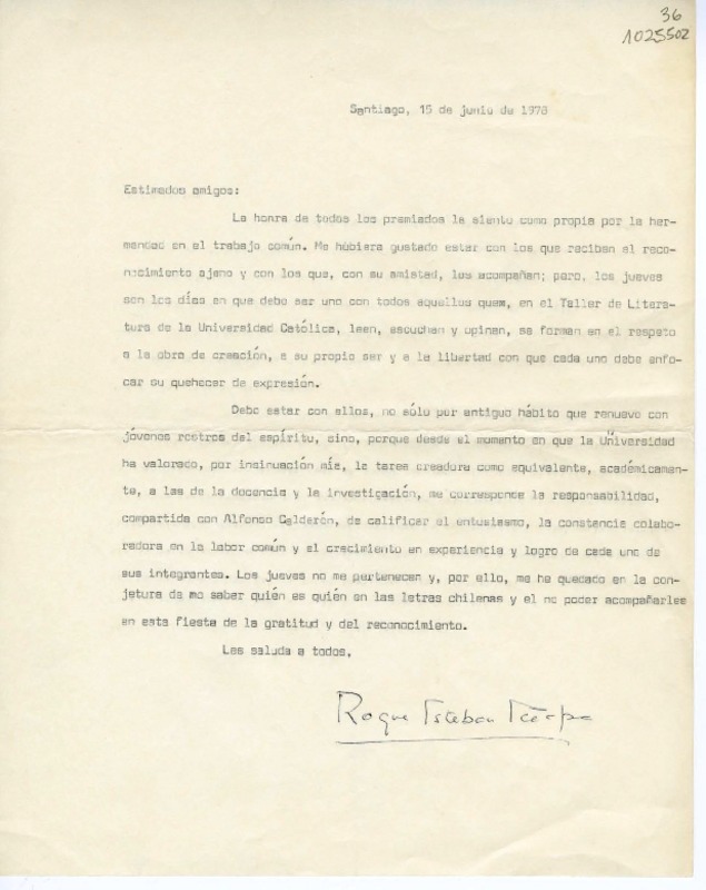 [Carta] 1978 junio 15, Santiago, Chile[a] Oreste Plath [manuscrito] Roque Esteban Scarpa.