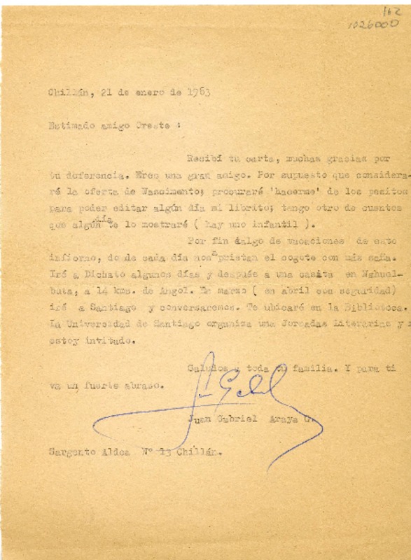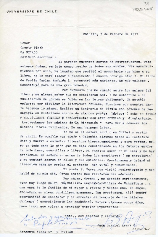 [Carta] 1977 febrero 3, Chillán, Chile [a] Oreste Plath [manuscrito] Juan Gabriel Araya G.