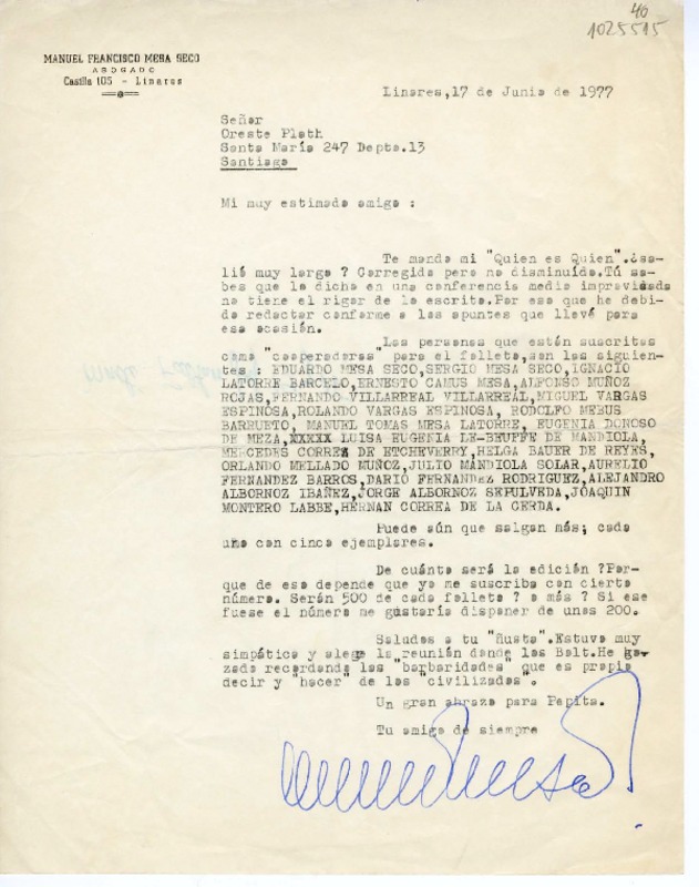 [Carta] 1977 junio 17, Linares, Chile [a] Oreste Plath [manuscrito] Manuel Francisco Mesa Seco.