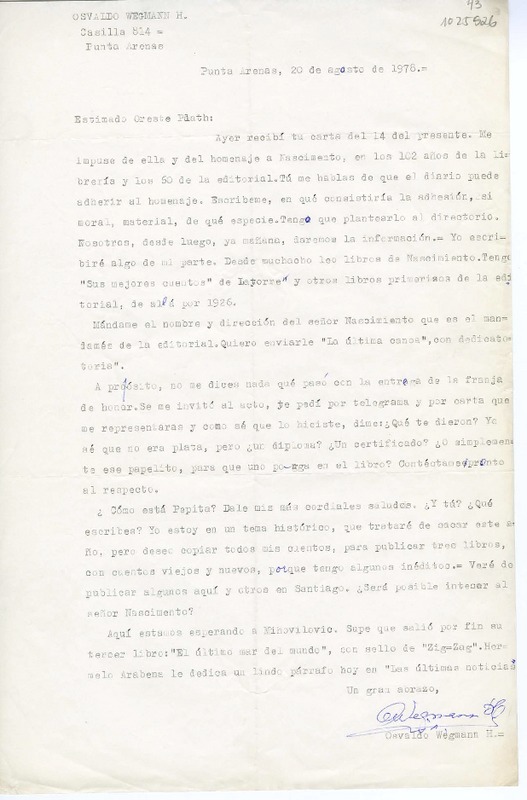 [Carta] 1978 agosto 20, Punta Arenas, Chile [a] Oreste Plath [manuscrito] Osvaldo Wegmann H.