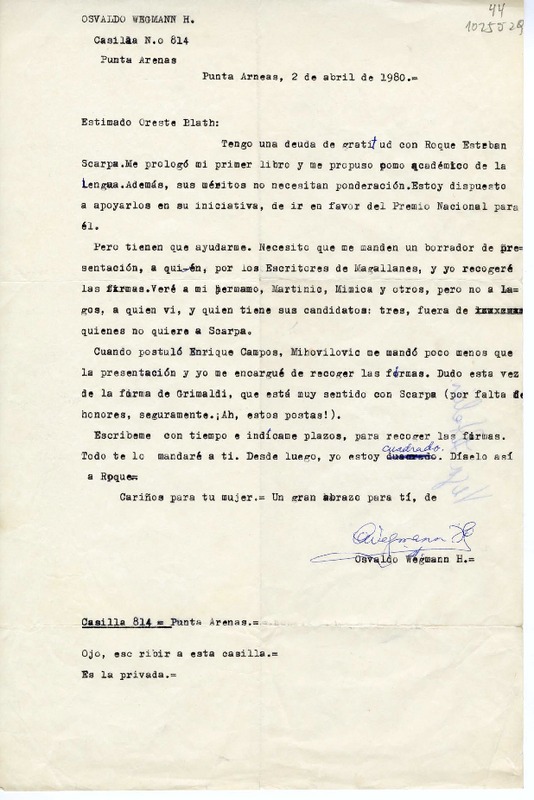 [Carta] 1980 abril 2, Punta Arenas, Chile [a] Oreste Plath [manuscrito] Osvaldo Wegmann H.