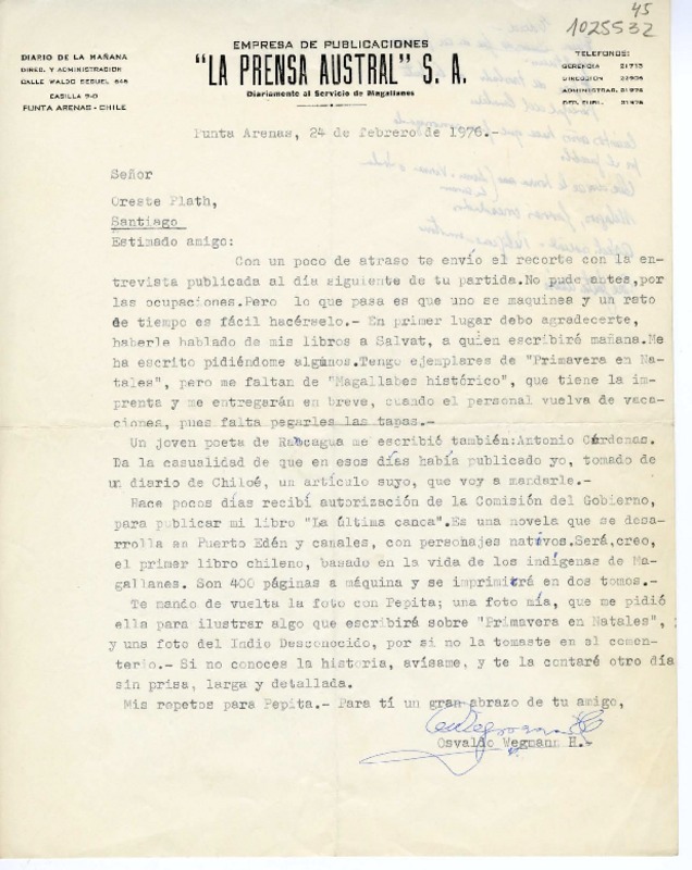 [Carta] 1976 febrero 24, Punta Arenas, Chile [a] Oreste Plath [manuscrito] Osvaldo Wegmann H.