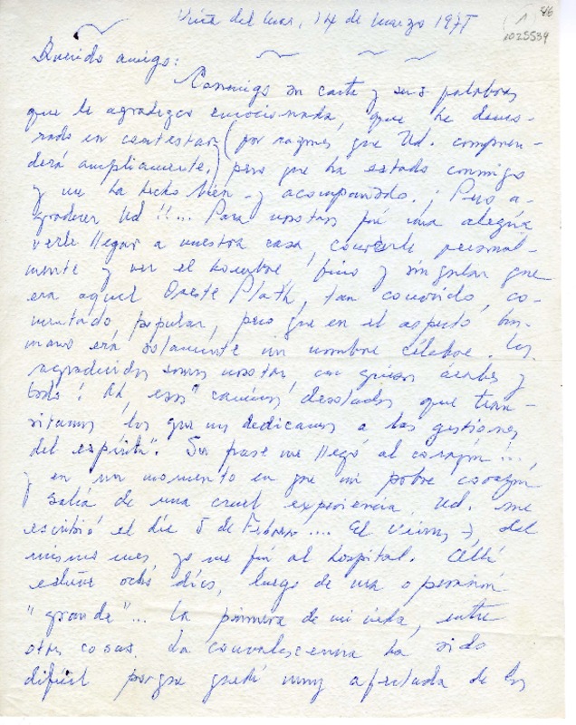 [Carta] 1975 marzo 14, Viña del Mar, Chile [a] Oreste Plath [manuscrito] Sara Vial.