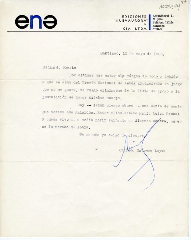 [Carta] 1980 mayo 12, Santiago, Chile [a] Oreste Plath [manuscrito] Orlando Cabrera Leyva.