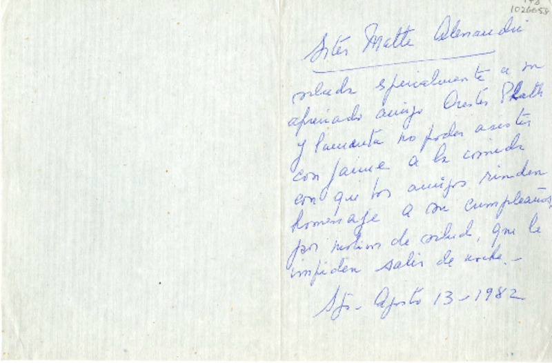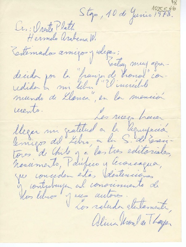 [Carta] 1978 junio 10, Santiago, Chile [a] Oreste Plath [manuscrito] Alicia Morel.