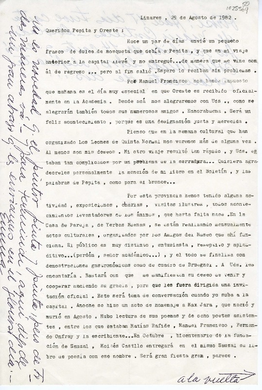 Plath, Oreste - Correspondencia - Autores chilenos - Manuscritos chilenos - Vial, Sara