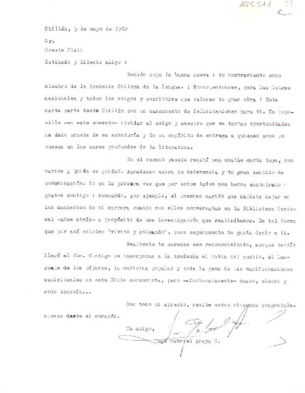 Correspondencia - Araya G., Juan Gabriel - Plath, Oreste - Manuscritos chilenos - Autores chilenos