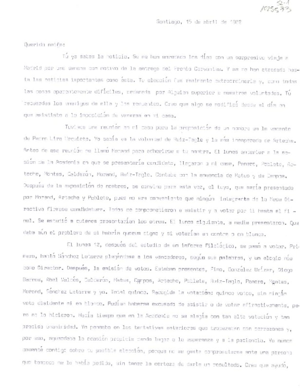 [Carta] 1979 abril 20, Santiago, Chile [a] Oreste Plath [manuscrito] Alicia Morel.
