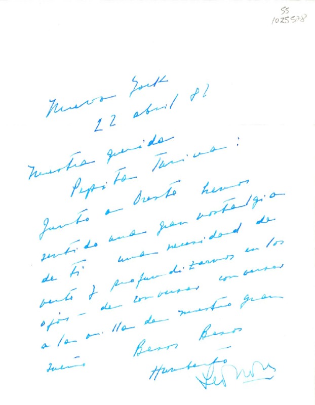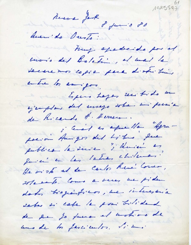 [Carta] 1980 junio 8, New York [a] Oreste Plath [manuscrito] Humberto Díaz Casanueva.