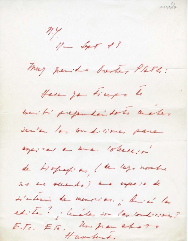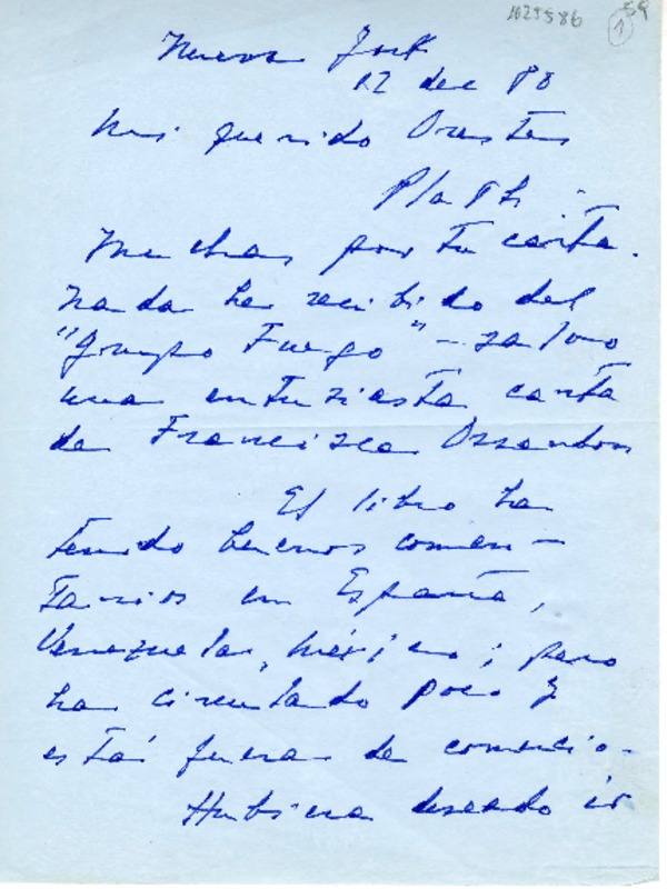 [Carta] 1988 diciembre 12, Nueva York [a] Oreste Plath [manuscrito] Humberto Díaz Casanueva.