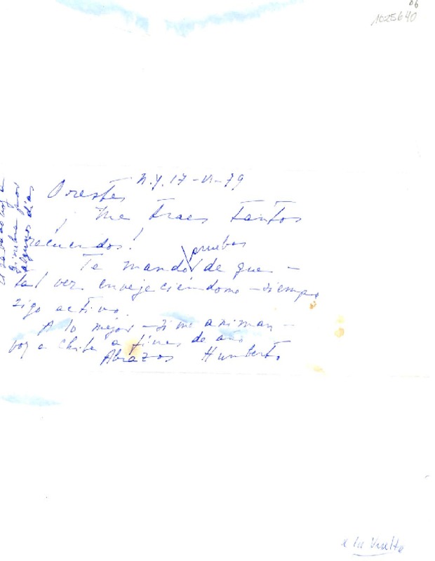 [Tarjeta] 1979 octubre, Antofagasta, [Chile] [a] Oreste Plath [manuscrito] Andrés Sabella.
