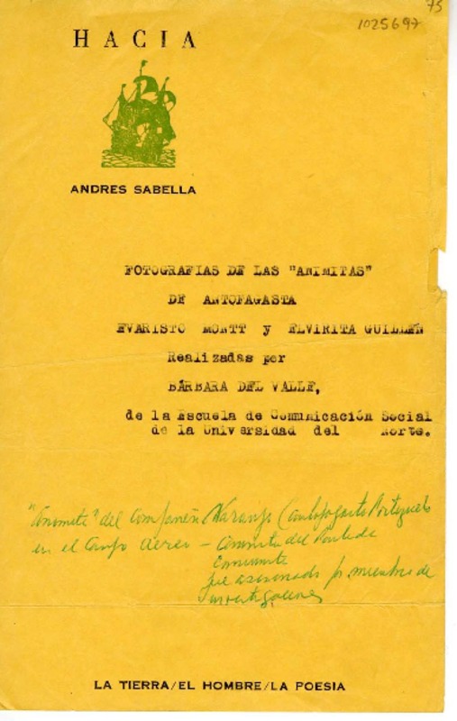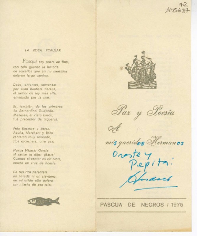 [Tarjeta] 1975, Pascua de Negros, Antofagasta, Chile [a] Oreste Plath [manuscrito] Andrés Sabella.