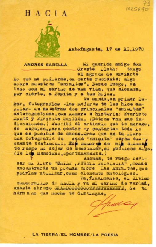 [Carta] 1970, Antofagasta, Chile [a] Oreste Plath [manuscrito] Andrés Sabella.