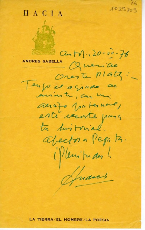 [Carta] 1976 junio 20, Antofagasta, Chile [a] Oreste Plath [manuscrito] Andrés Sabella.