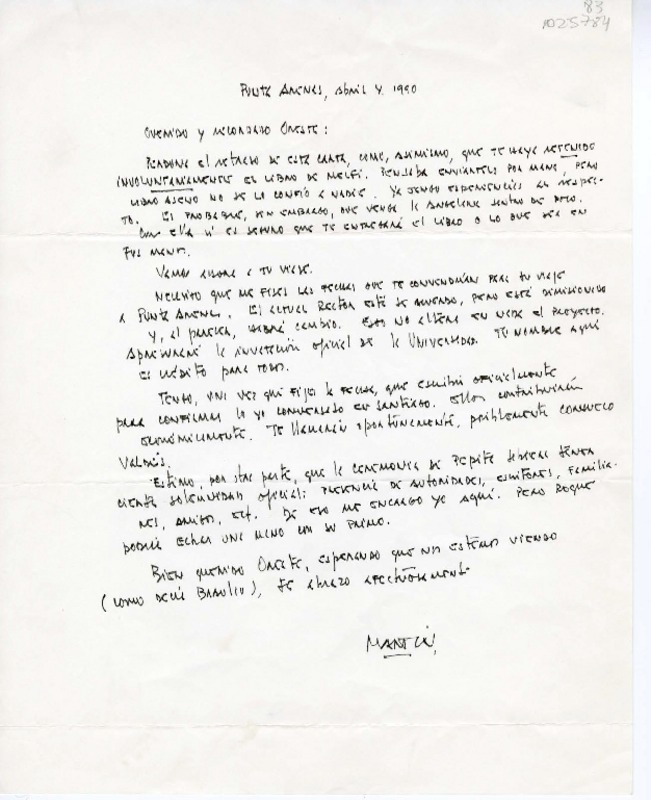[Carta] 1990 abril 4, Punta Arenas, Chile [a] Oreste Plath [manuscrito] Martín Cerda.