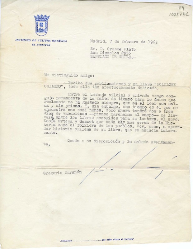 [Carta] 1963 febrero 7, Madrid, España [a] Oreste Plath, Santiago de Chile [manuscrito] Gregorio Marañón Moya.