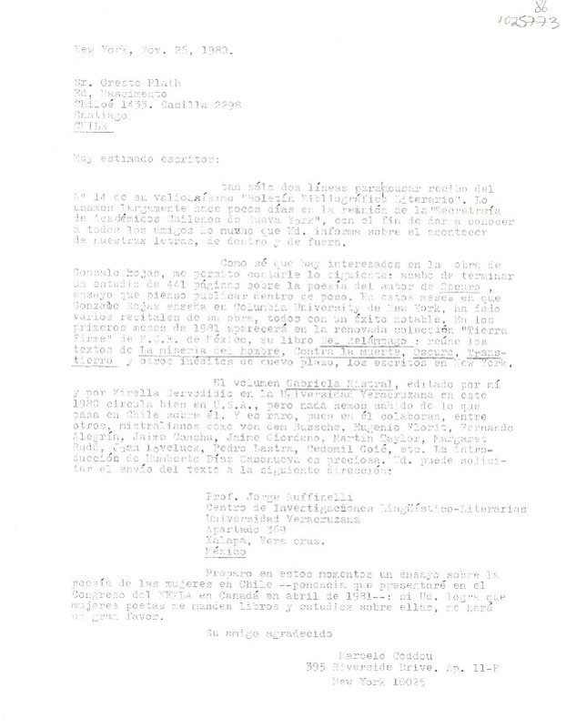 [Carta] [1980] New York [a] Oreste Plath, Florida, [EE.UU] [manuscrito] Marcelo Coddou.