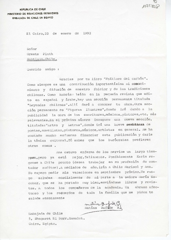 [Carta] 1992 enero 23, El Cairo, Egipto [a] Oreste Plath, Santiago, Chile [manuscrito] Matías Rafide B.