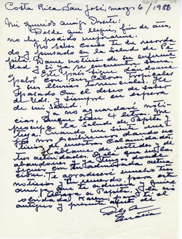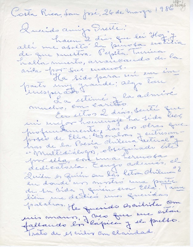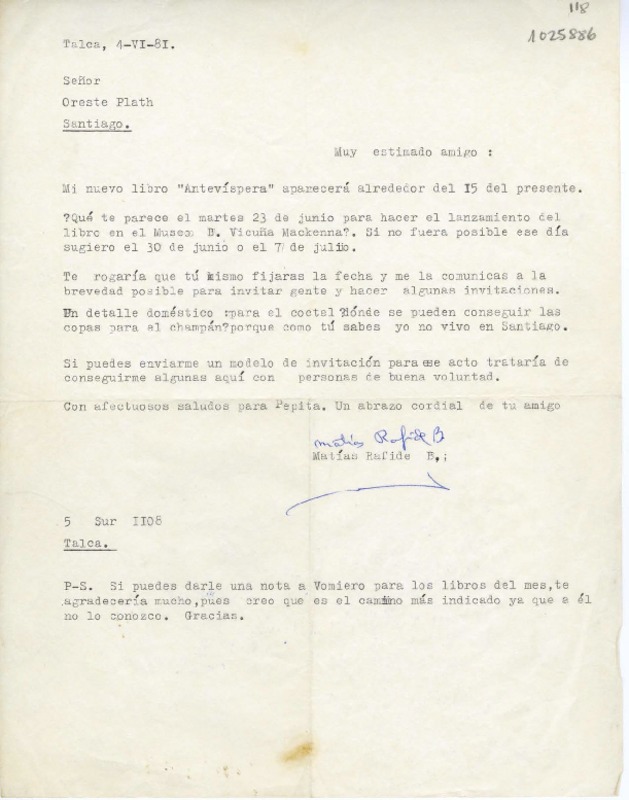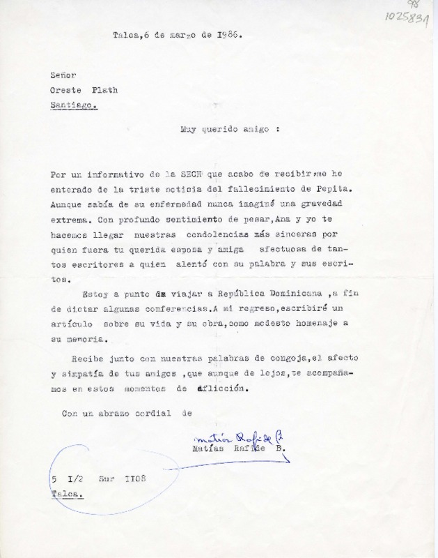 [Carta] 1986 marzo 6, Talca, Chile [a] Oreste Plath [manuscrito] Matías Rafide.