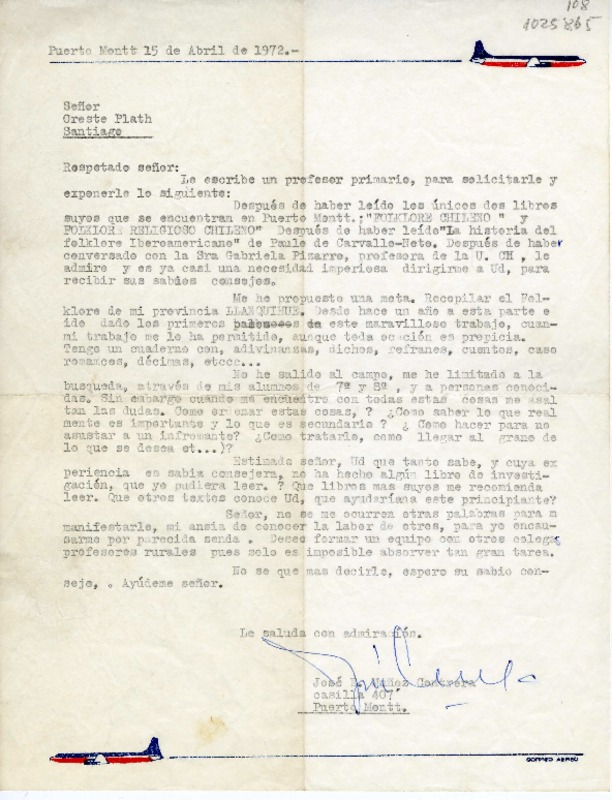 [Carta] 1972 abril 15, Puerto Montt, Chile [a] Oreste Plath [manuscrito] José Muñoz Contreras.