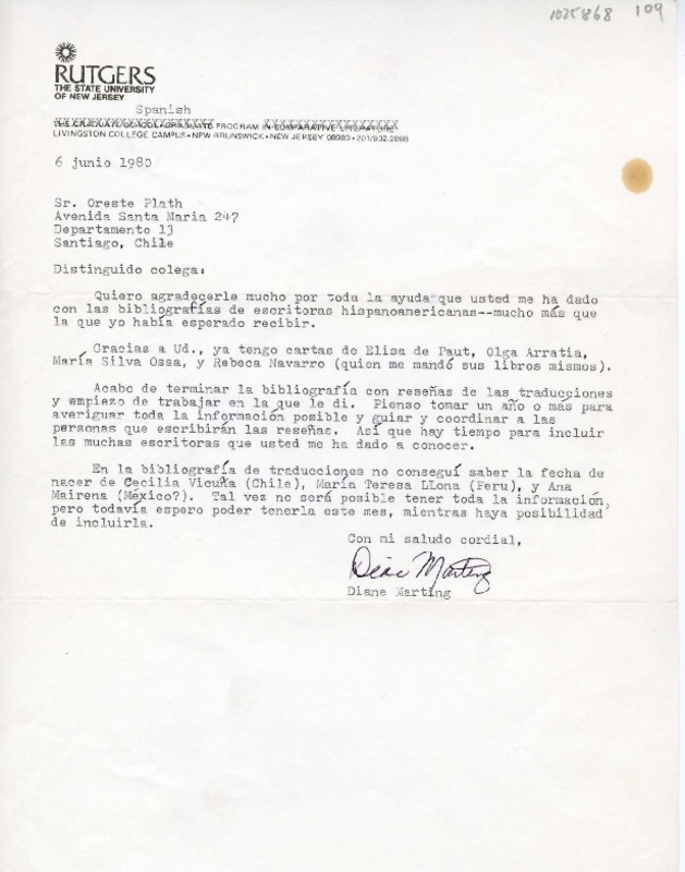 [Carta] 1980 junio 6, New Jersey [a] Oreste Plath, Santiago, Chile [manuscrito] Diane Marting.