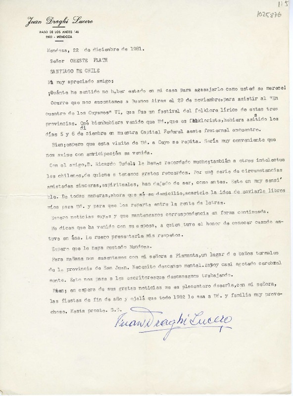 [Carta] 1975 julio 12, Mendoza, Argentina [a] Oreste Plath, Santiago, Chile [manuscrito] Juan Draghi Lucero.