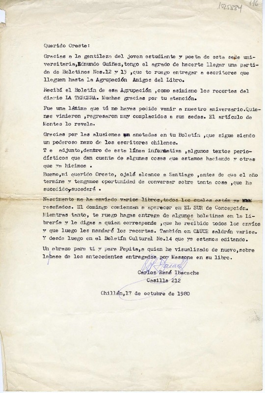 [Carta] 1979 noviembre 6, Chillán, Chile [a] Oreste Plath [manuscrito] Sergio Hernández.