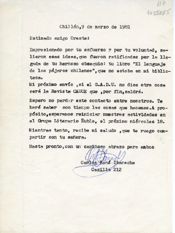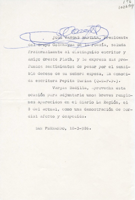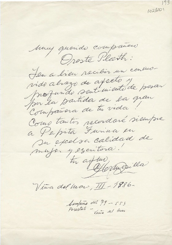 [Carta] 1986 marzo, Viña del Mar, Chile [a] Oreste Plath [manuscrito] Carlos Hermosilla Álvarez.