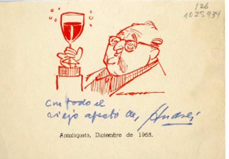 [Tarjeta] 1965 diciembre, Antofagasta, [Chile] [a] Oreste Plath [manuscrito] Andrés Sabella.