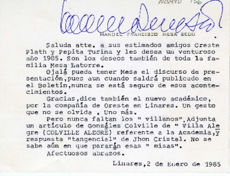 [Tarjeta] 1985 enero 2, Linares, Chile [a] Oreste Plath [manuscrito] Manuel Francisco Mesa Seco.