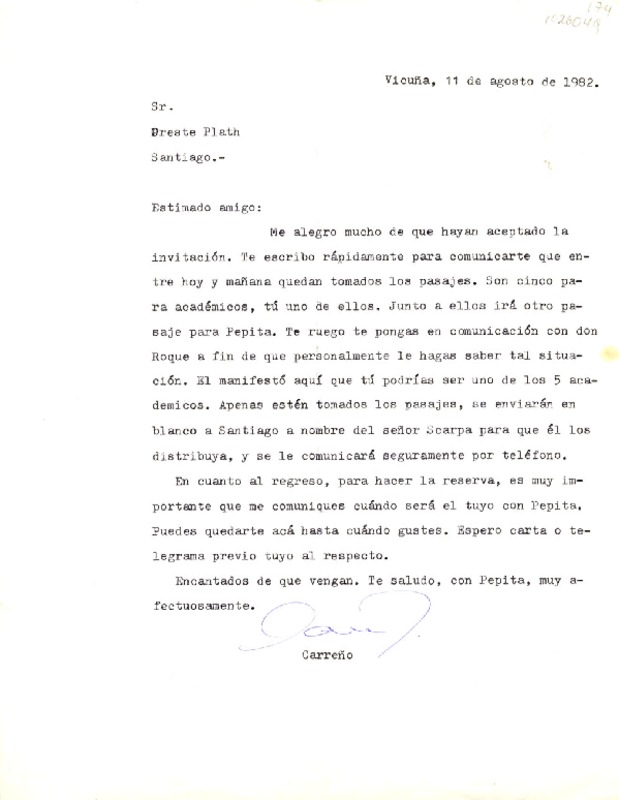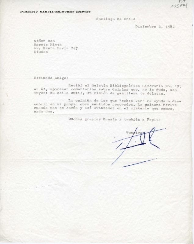 García-Huidobro Montes, Patricio - Plath, Oreste - Manuscritos chilenos - Autores chilenos - Correspondencia