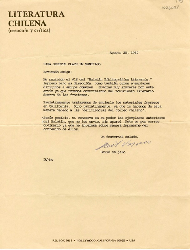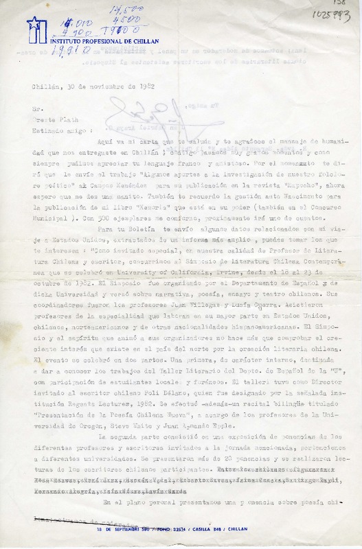 Hernández, Sergio - Manuscritos chilenos - Autores chilenos - Correspondencia - Plath, Oreste