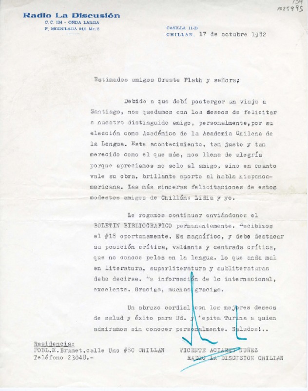 [Carta] 1990 octubre 15, Temuco, Chile [a] Oreste Plath [manuscrito] Alicia Candia B.