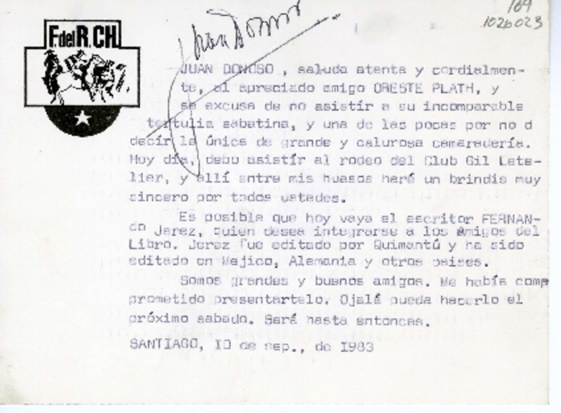 [Tarjeta] 1983 septiembre 10, Santiago, Chile [a] Oreste Plath [manuscrito] Juan Donoso.