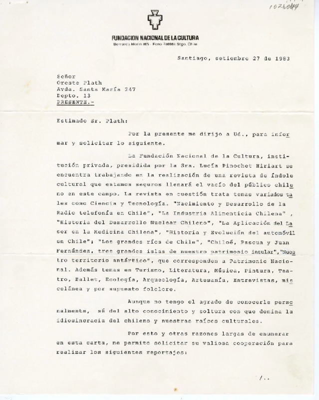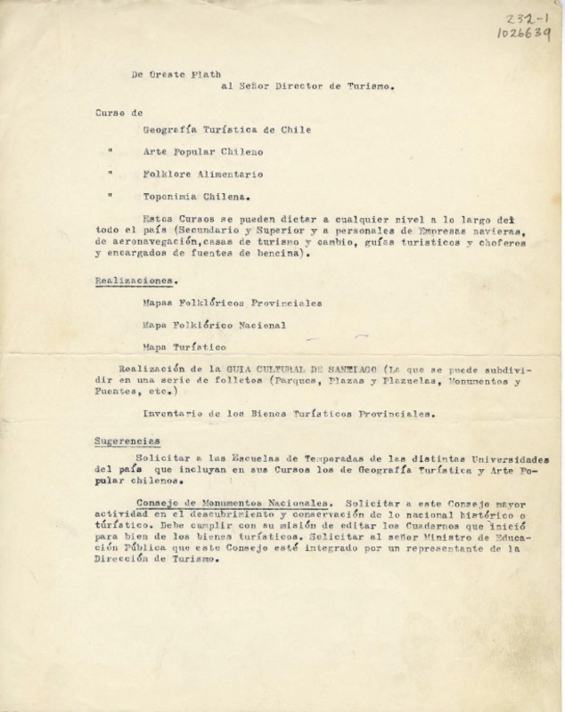 [Carta] [1975], [Santiago, Chile] [al] Director de Turismo [manuscrito] Oreste Plath.