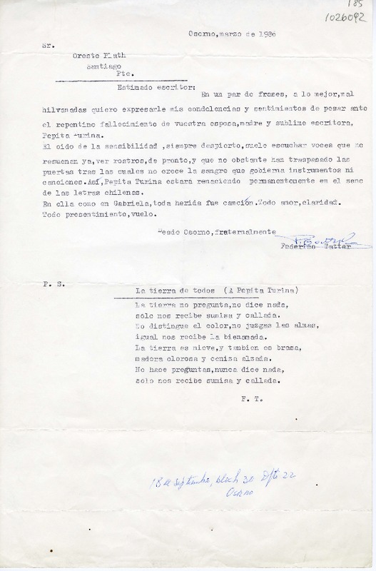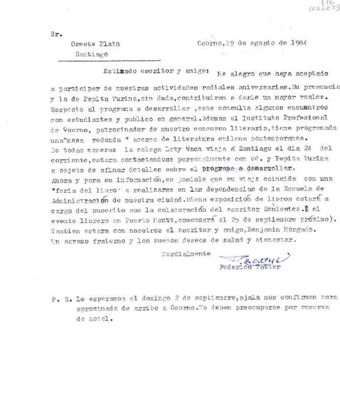 [Carta] 1986 marzo, Osorno, Chile [a] Oreste Plath [manuscrito] Federico Tatter Oñate.