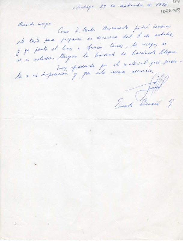 [Carta] 1990 septiembre 22, Santiago, Chile [a] Oreste Plath [manuscrito] Ernesto Livacic Gazzano.