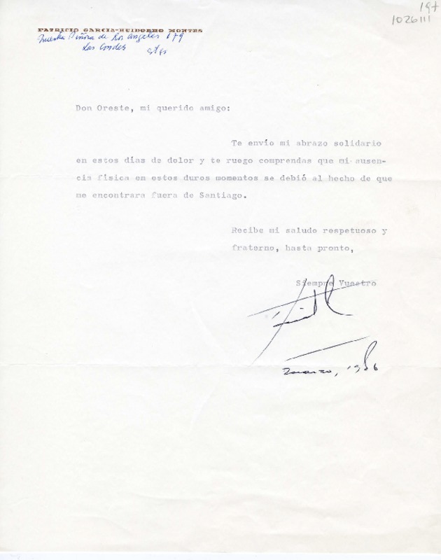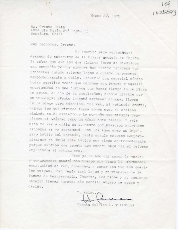 [Carta] 1986 marzo, Santiago, Chile [a] Oreste Plath [manuscrito] Patricio García-Huidobro Montes.