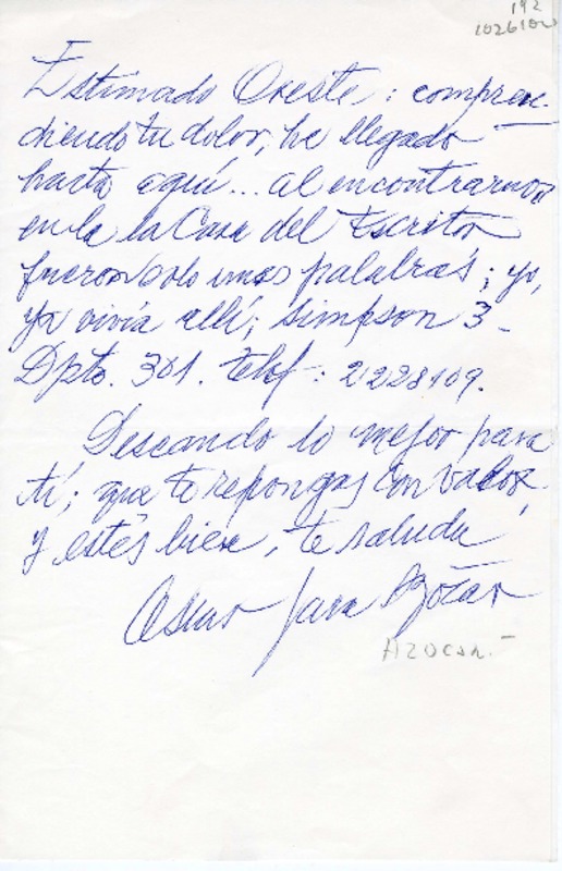 [Carta] [1986], Santiago, Chile [a] Oreste Plath [manuscrito] Oscar Jara Azócar.