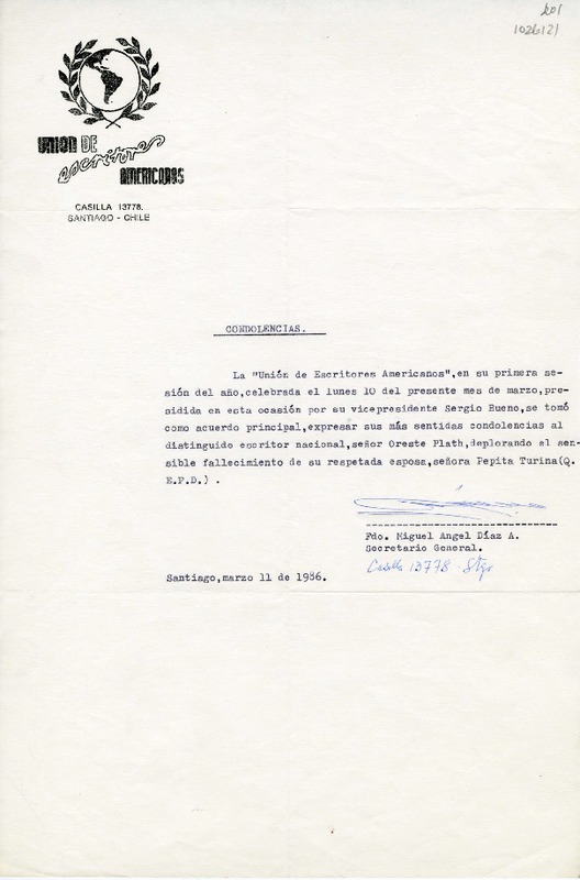 Correspondencia - Autores chilenos - Manuscritos chilenos - Plath, Oreste - Adriazola, Ximena