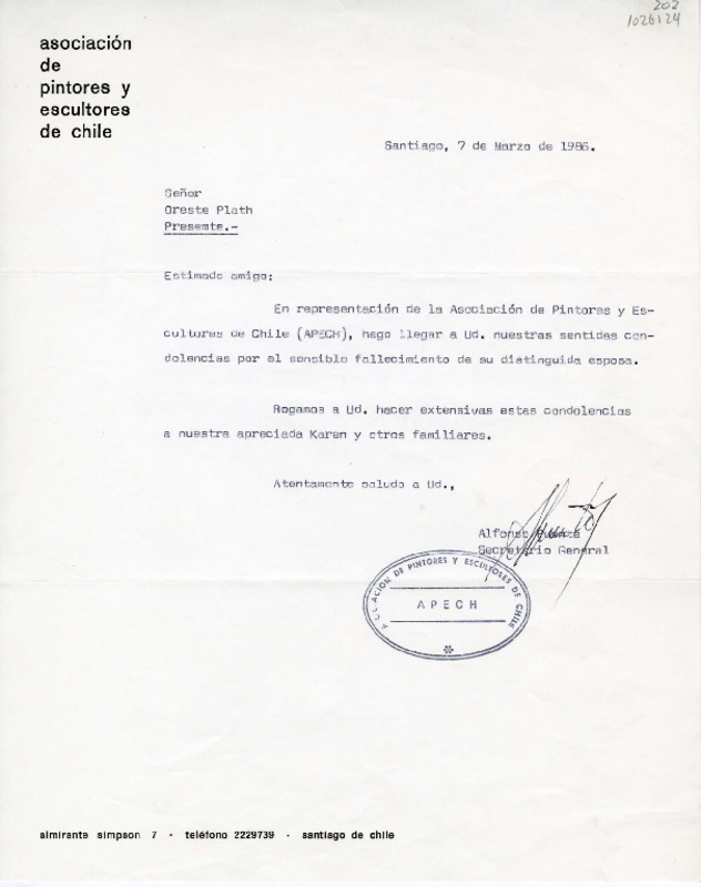 Asociación de Pintores y Escultores de Chile - Plath, Oreste - Manuscritos chilenos - Autores chilenos - Correspondencia