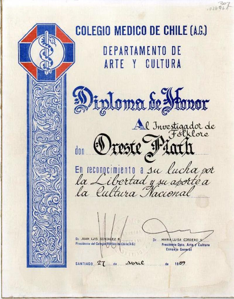 [Diploma] 1989 abril 27, Santiago, Chile [a] Oreste Plath [manuscrito] Colegio Médico de Chile A.G.