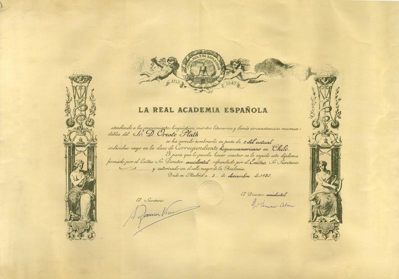 [Diploma] 1982 agosto 30, Santiago, Chile [a] Oreste Plath [manuscrito] Academia de Chile Correspondiente a la Real Academia Española.