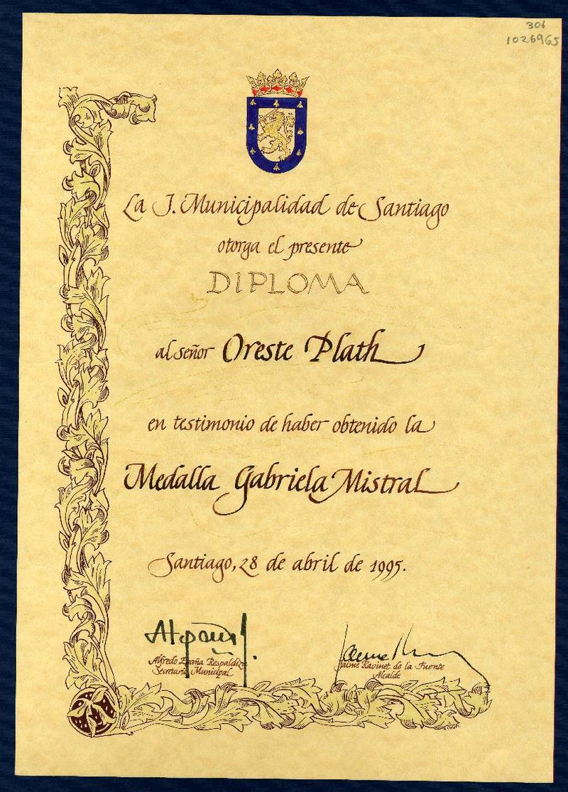 [Diploma] 1995 abril 28, Santiago, Chile [a] Oreste Plath [manuscrito] Municipalidad de Santiago (Chile).