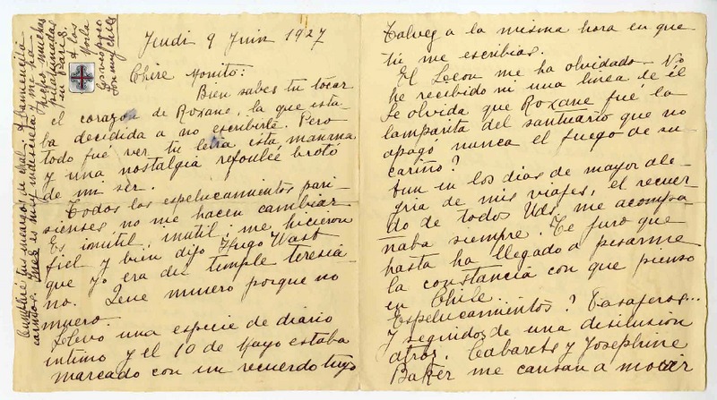 [Carta] 1927 junio 9, París, Francia [a una amiga "Monito"] [manuscrito] Elvira Santa Cruz Ossa (Roxane).