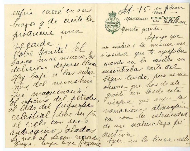 [Carta] 1926 septiembre 15, A bordo del "Oroya" en el mar Atlántico [a una amiga "Monito"] [manuscrito] Elvira Santa Cruz Ossa (Roxane).